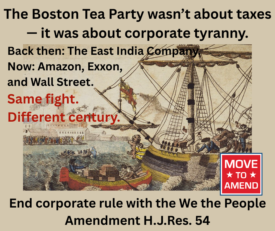 Move to Amend carries forward that unfinished revolution, working to end the legal doctrines that grant corporations constitutional rights and treat money as free speech. Just as the patriots dumped tea to oppose governance shaped by corporate monopoly, we organize today to build what democracy has always promised — a system where We the People, not corporate entities, decide the direction of our democracy.