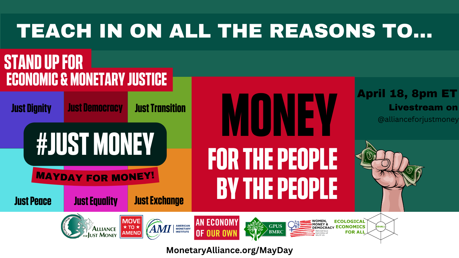 Join us for a special livestream panel discussion hosted by the Alliance for Just Money in collaboration with Move to Amend. This event serves as a TEACH-in leading up to the Mayday for Money March taking place in Chicago, IL, outside the Federal Reserve.