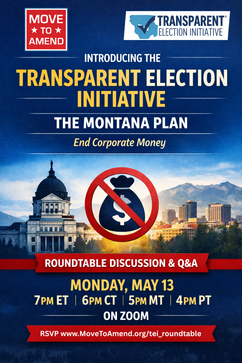 Join the Move to Amend and the Transparent Election Initiative (TEI) team for a dynamic round table discussion introducing the Corporate Power Reset Initiative AKA Transparent Election Initiative, AKA The Montana Plan: Whatever you call it, it is a bold, state-based strategy to end the influence of corporate and dark money in our political system.