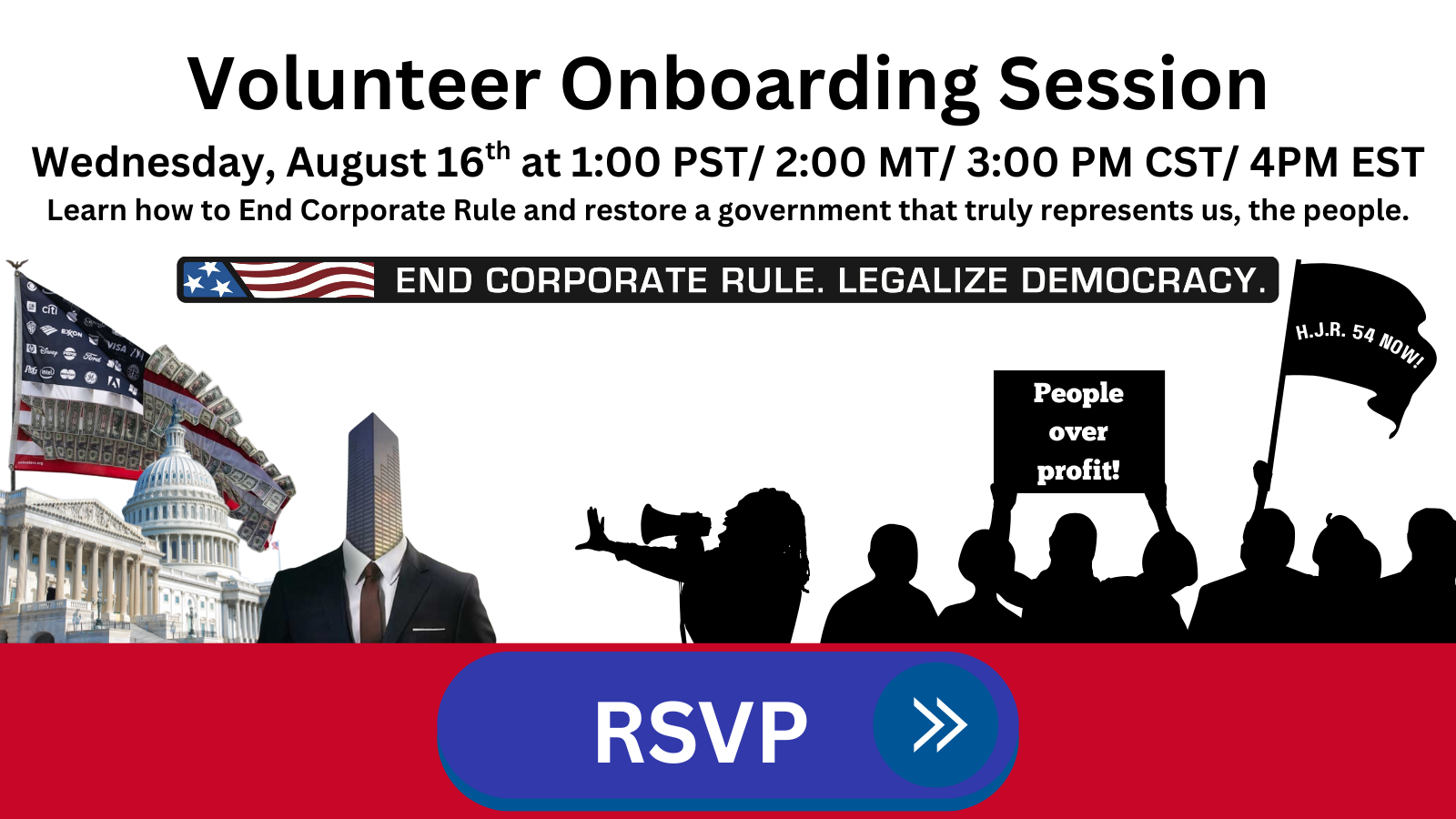 Join us to learn and ask questions about specific ways you can contribute your time, energy, and skills to further the growing movement to abolish big money in elections and corporate rule, both in your community and on our national projects.