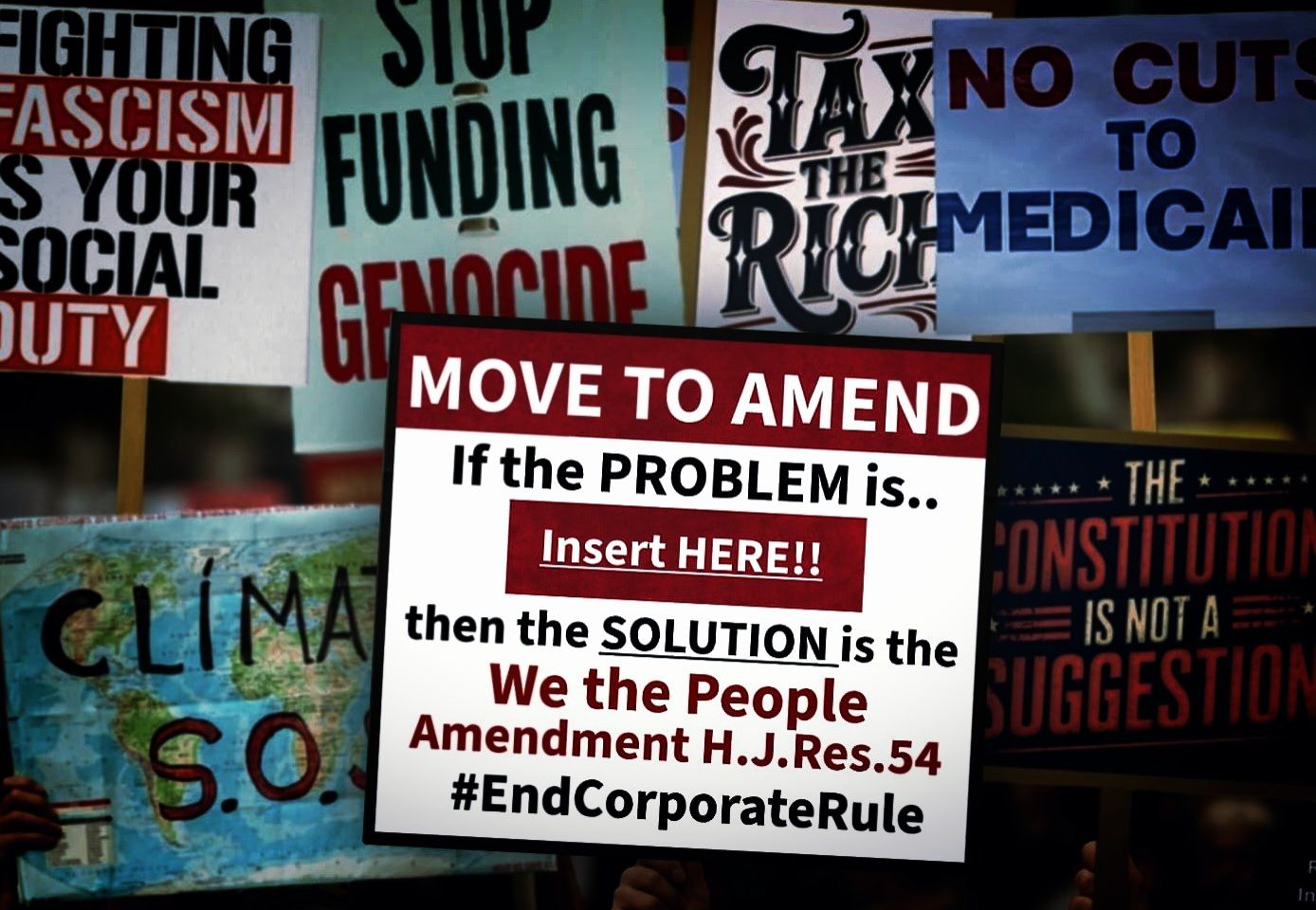 Move to Amend has a bold mission: pass the We the People Amendment (HJR 54) to end corporate constitutional rights and the false doctrine that money equals speech. Right now, we need to break through to a much bigger audience.