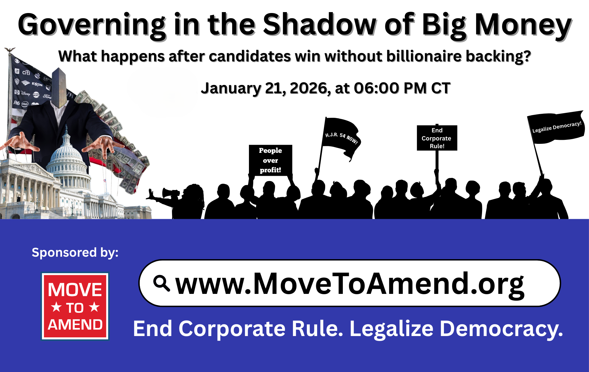 Join us to learn and ask questions about specific ways you can contribute your time, energy, and skills to further the growing movement to abolish big money in elections and corporate rule, both in your community and on our national projects.
