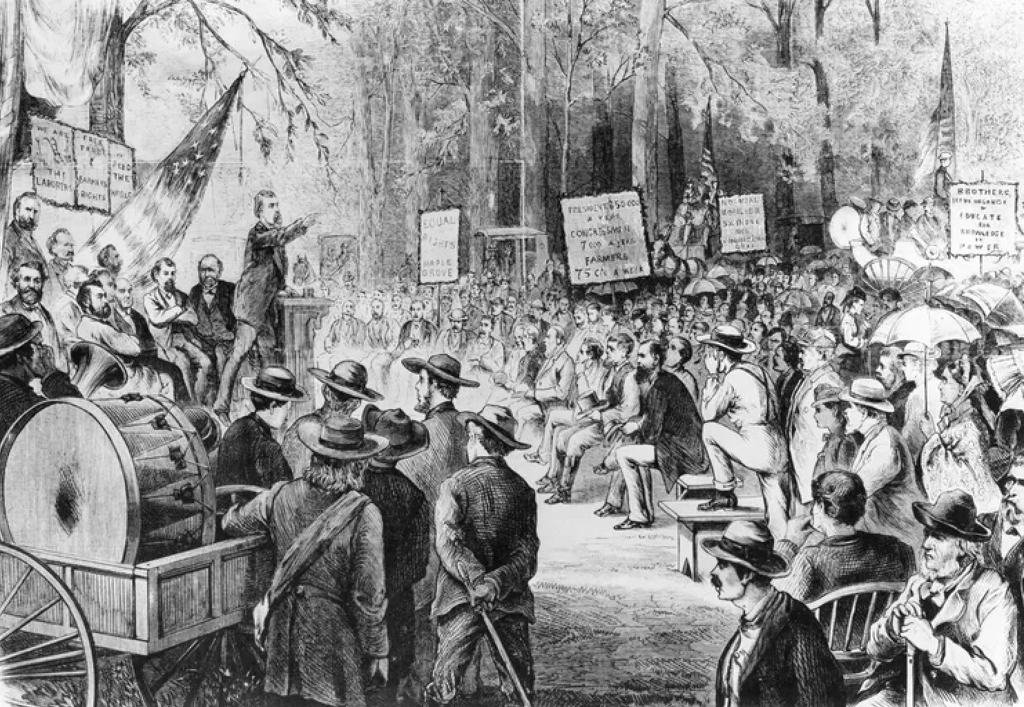 This was achieved through traveling lecturers – individuals who either came into the movement with a high degree of self-respect and awareness/personal experience of the dominant economic and political system, or who were recruited from existing Alliance members and trained. Lecturers would speak on the backs of wagons or halls as they traveled from town to town. They large numbers of people who were inspired and gained confidence and a collective desire to seek political change not only from what they heard, but from being in the presence, often, of thousands of others who attended. There were 40,000 lecturers in the Alliance lecturing system.